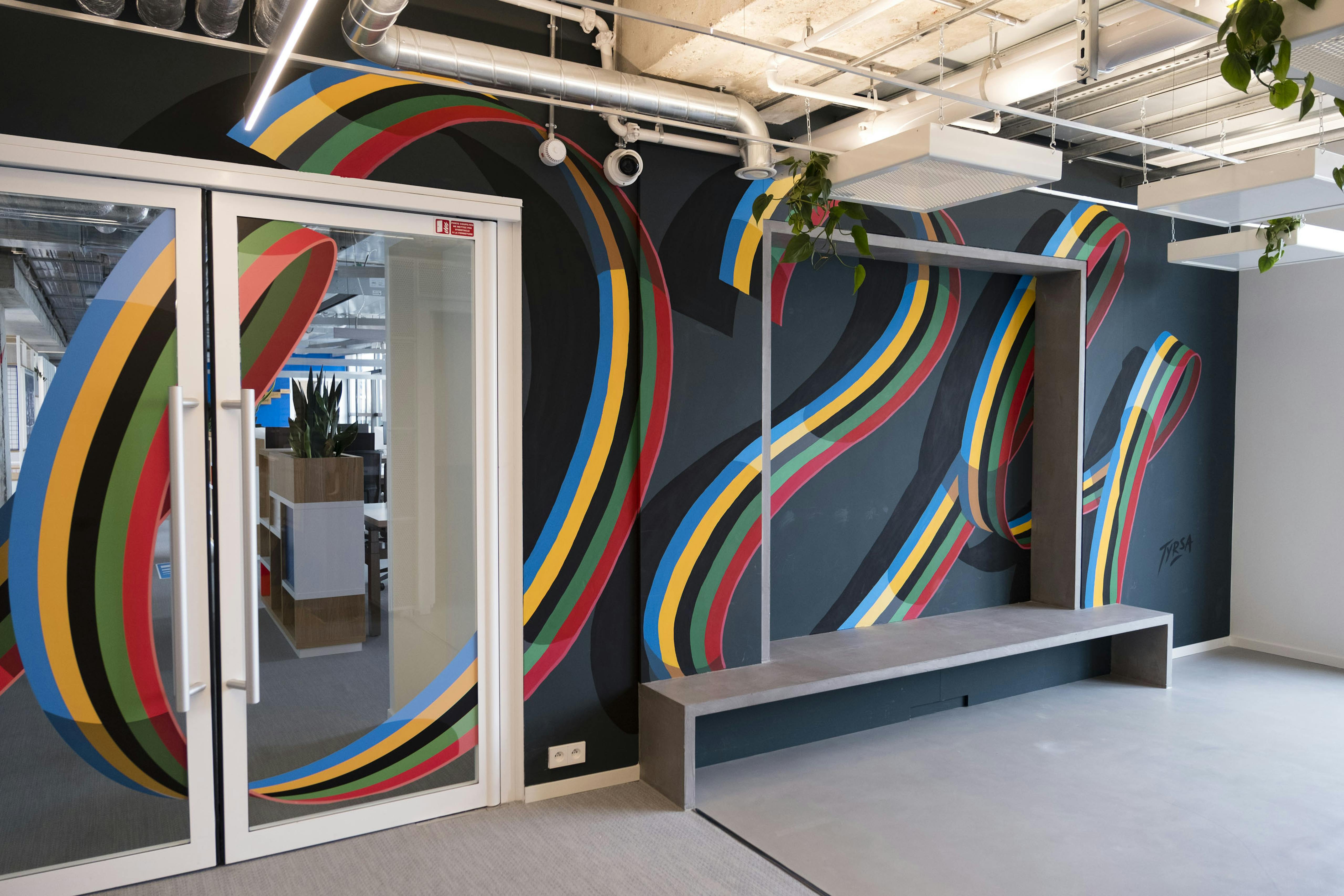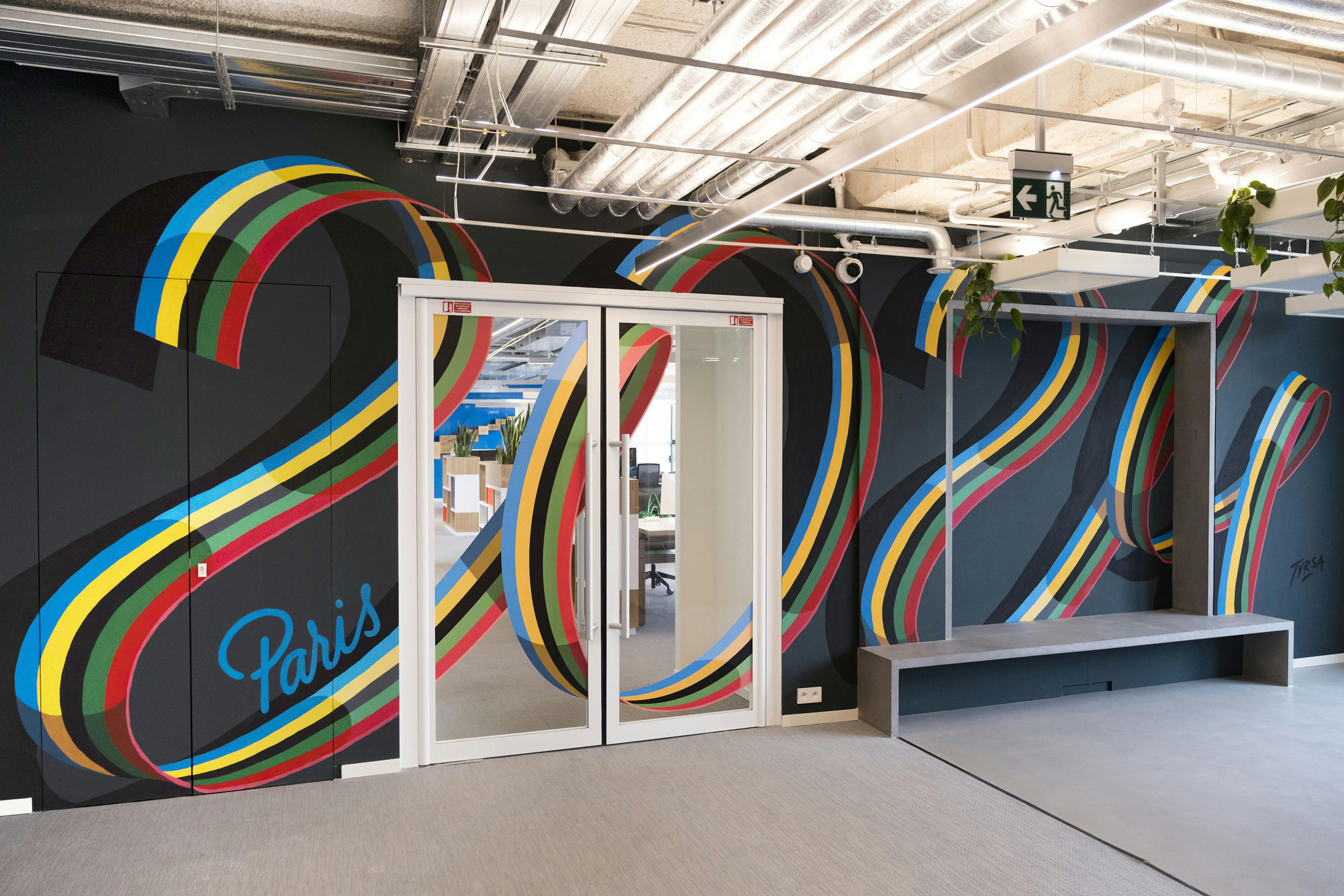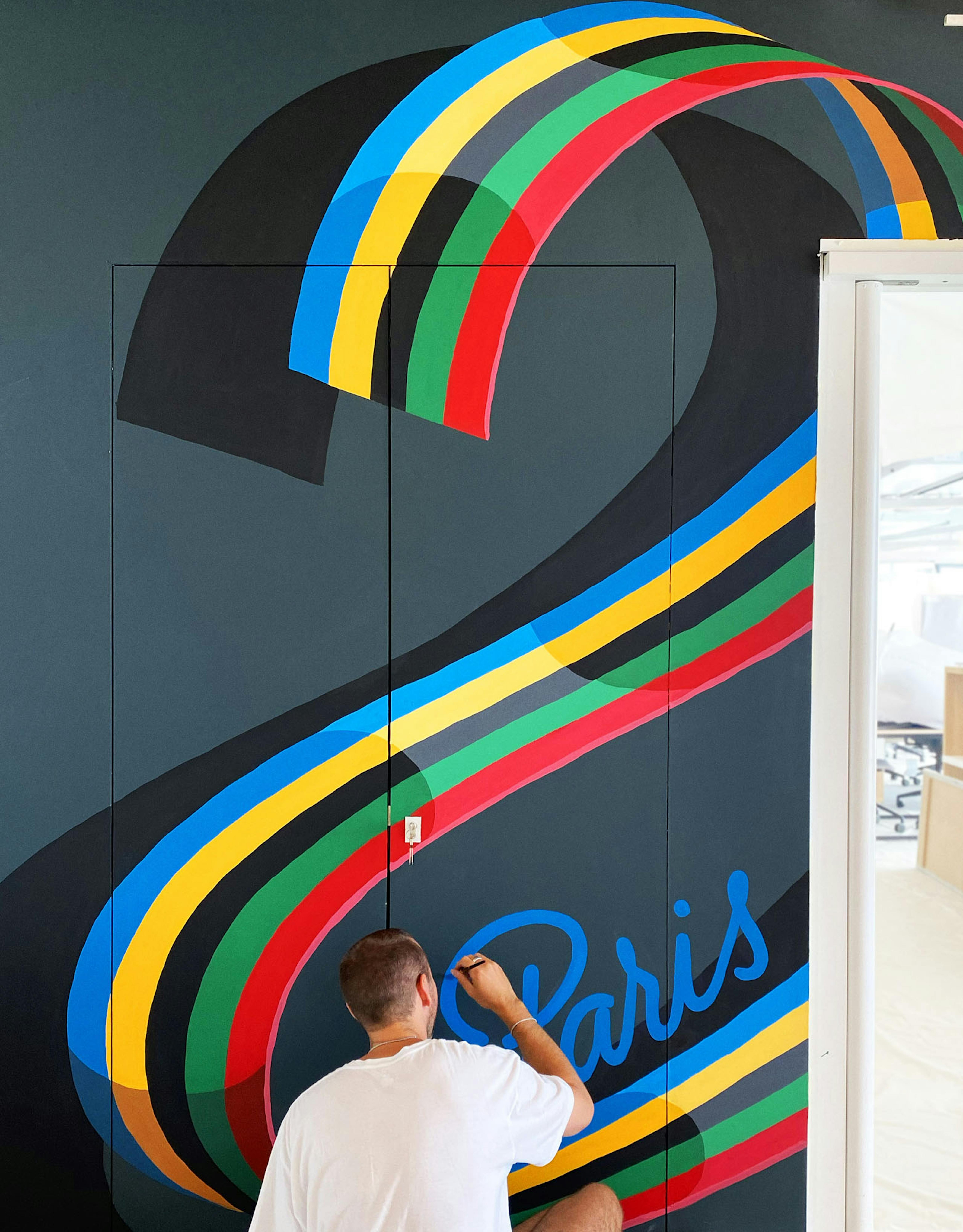 The second mural, positioned at the entrance of the floor, pays tribute to the Paris Olympic Games—celebrating the unity of nations and the diversity of sports disciplines. Entirely hand-painted in acrylic, it sets a dynamic and welcoming tone for the space.