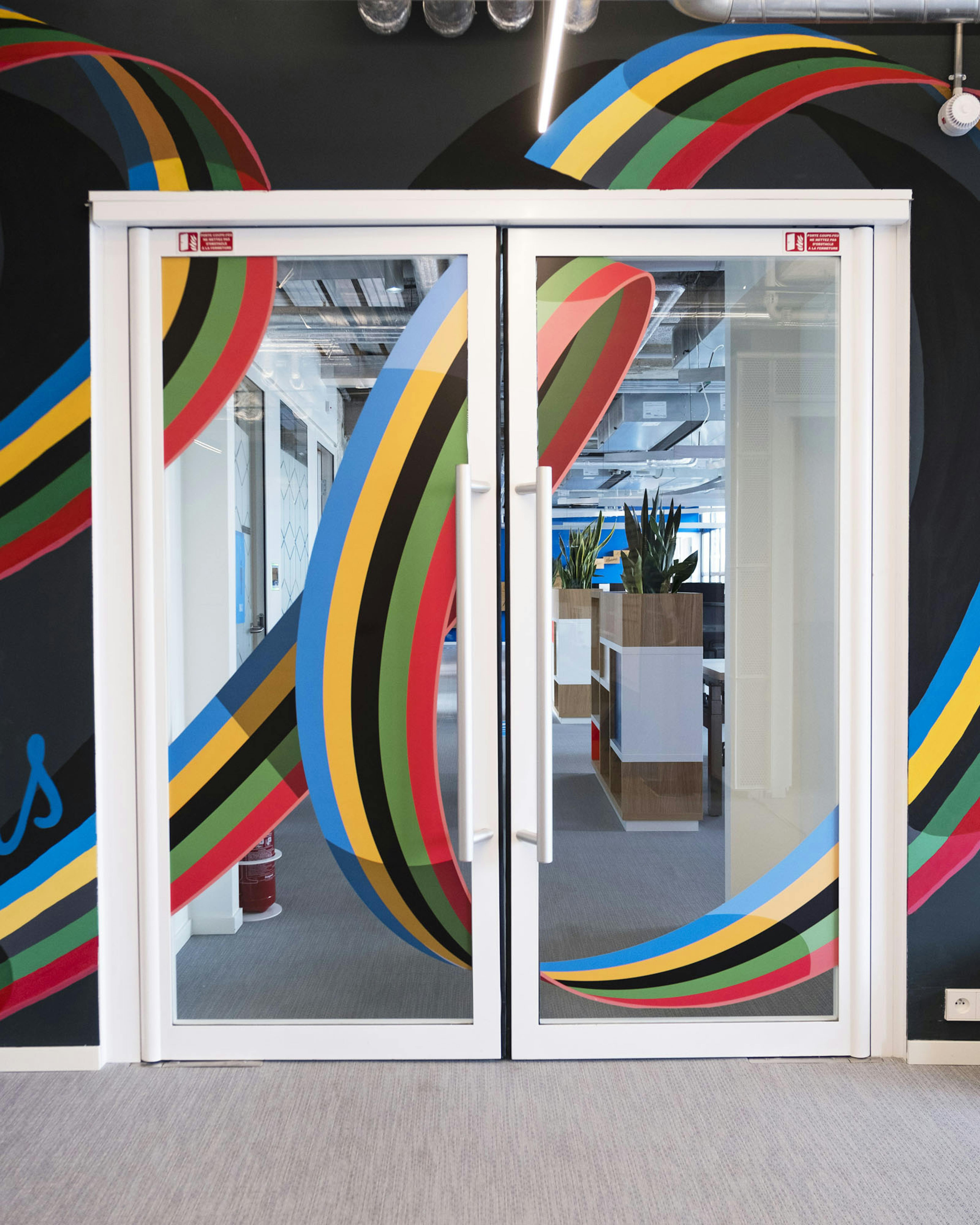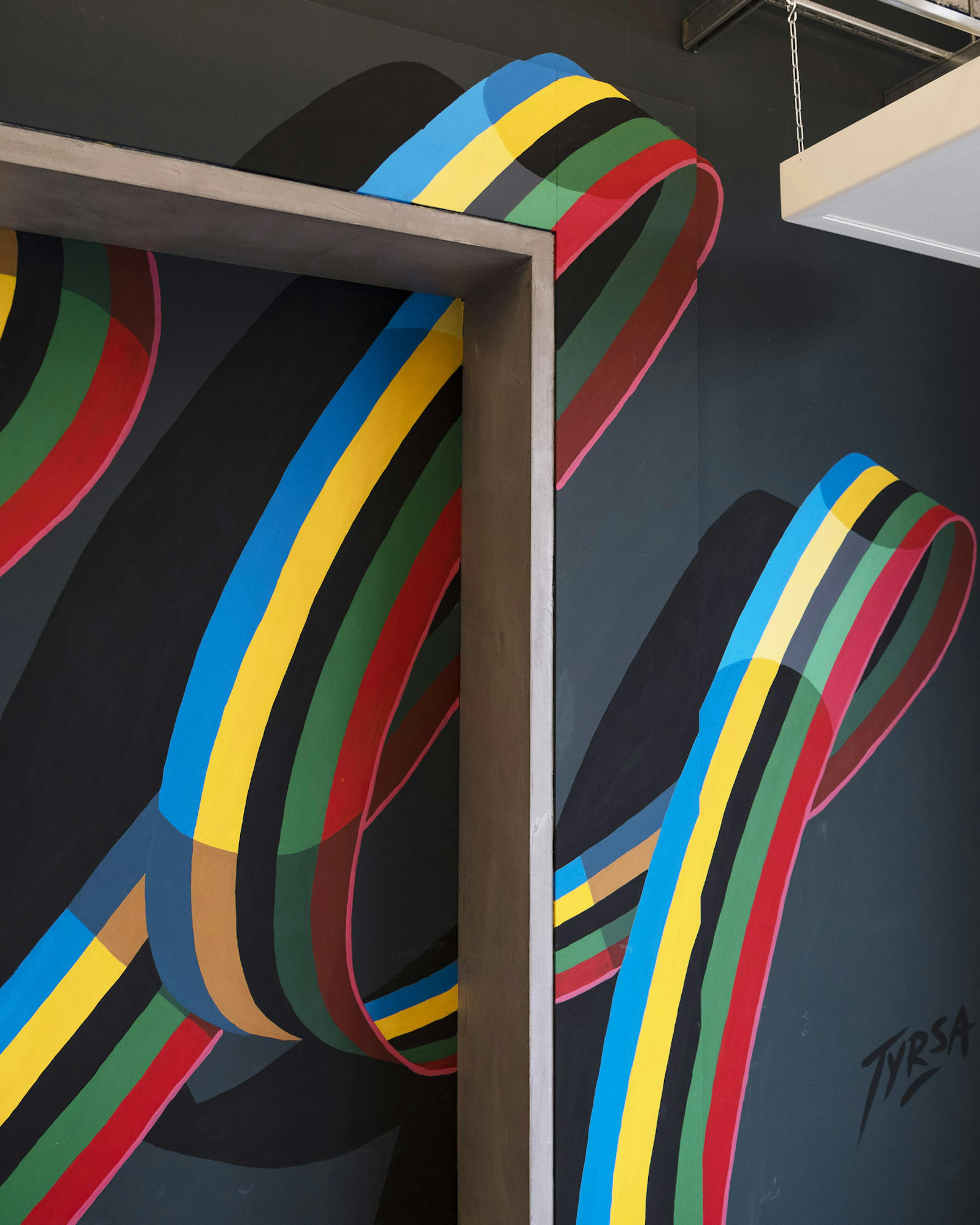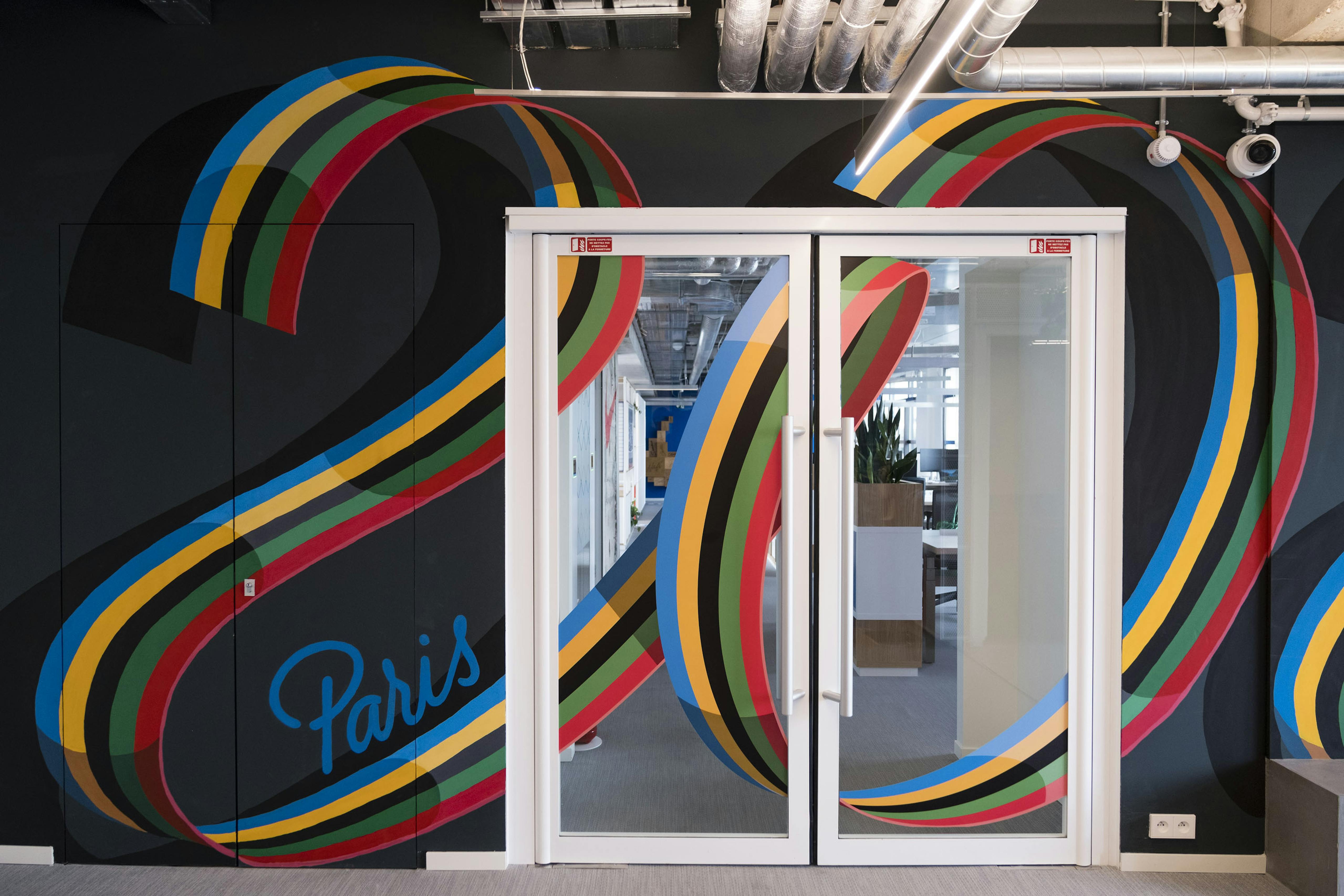 The second mural, positioned at the entrance of the floor, pays tribute to the Paris Olympic Games—celebrating the unity of nations and the diversity of sports disciplines. Entirely hand-painted in acrylic, it sets a dynamic and welcoming tone for the space.