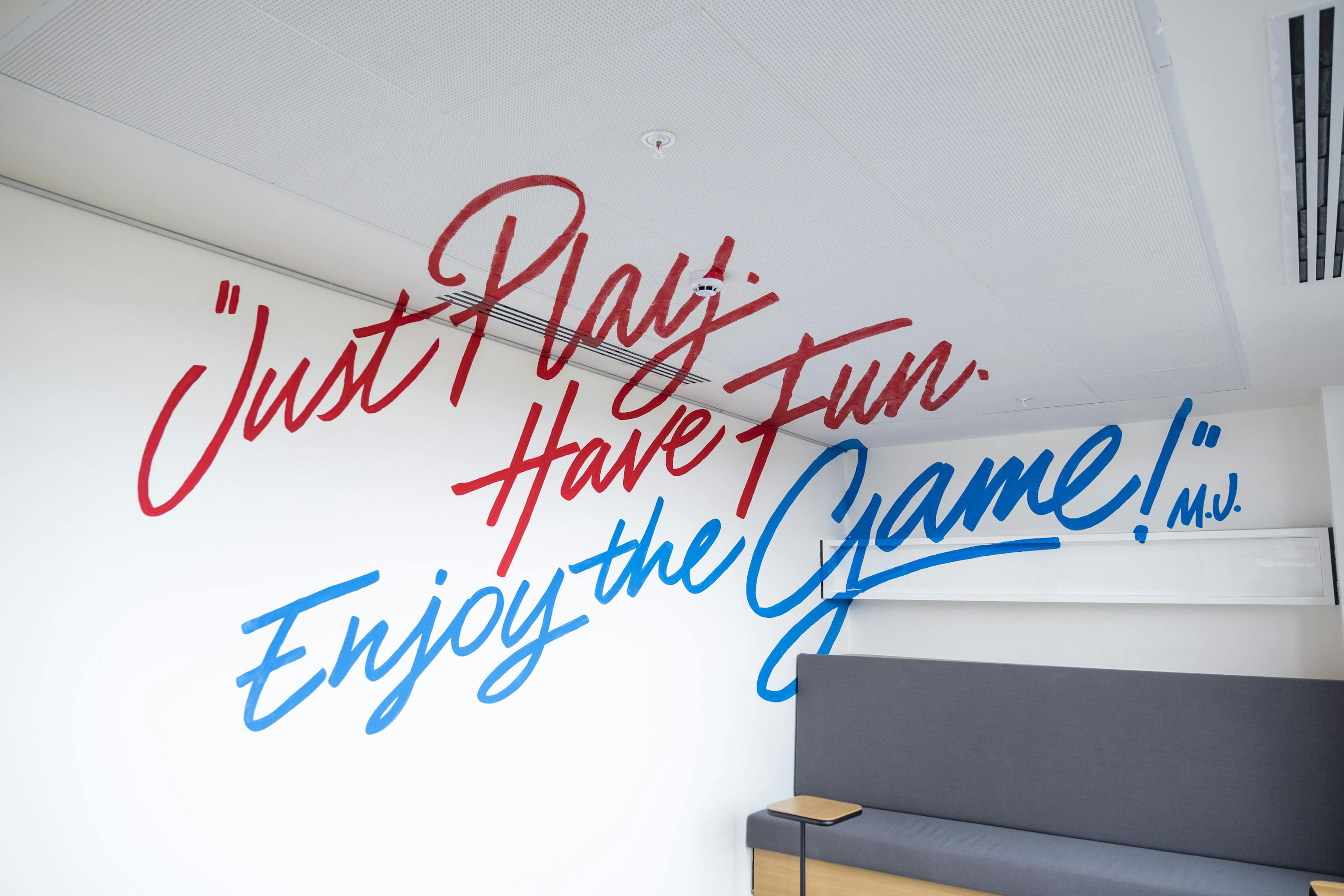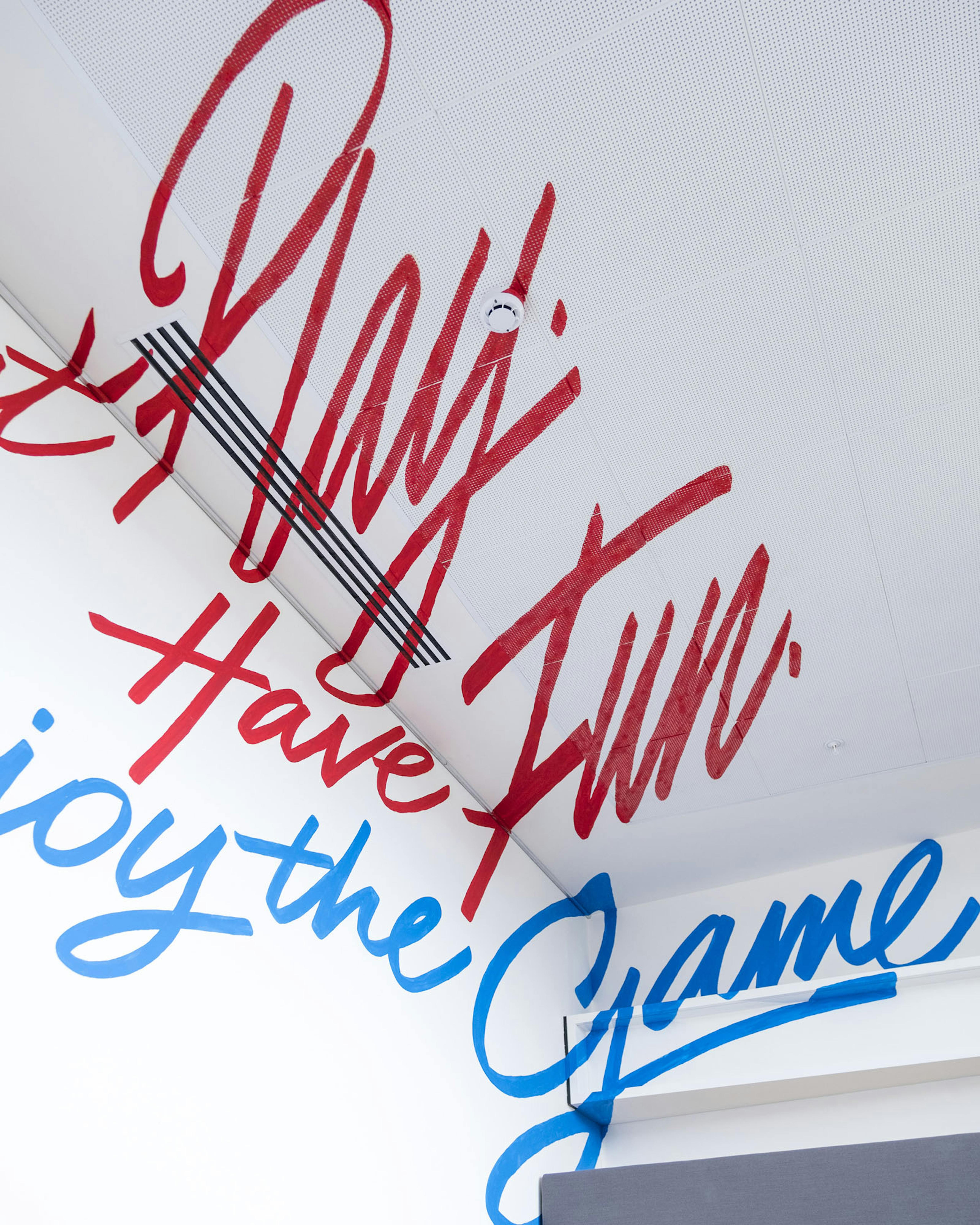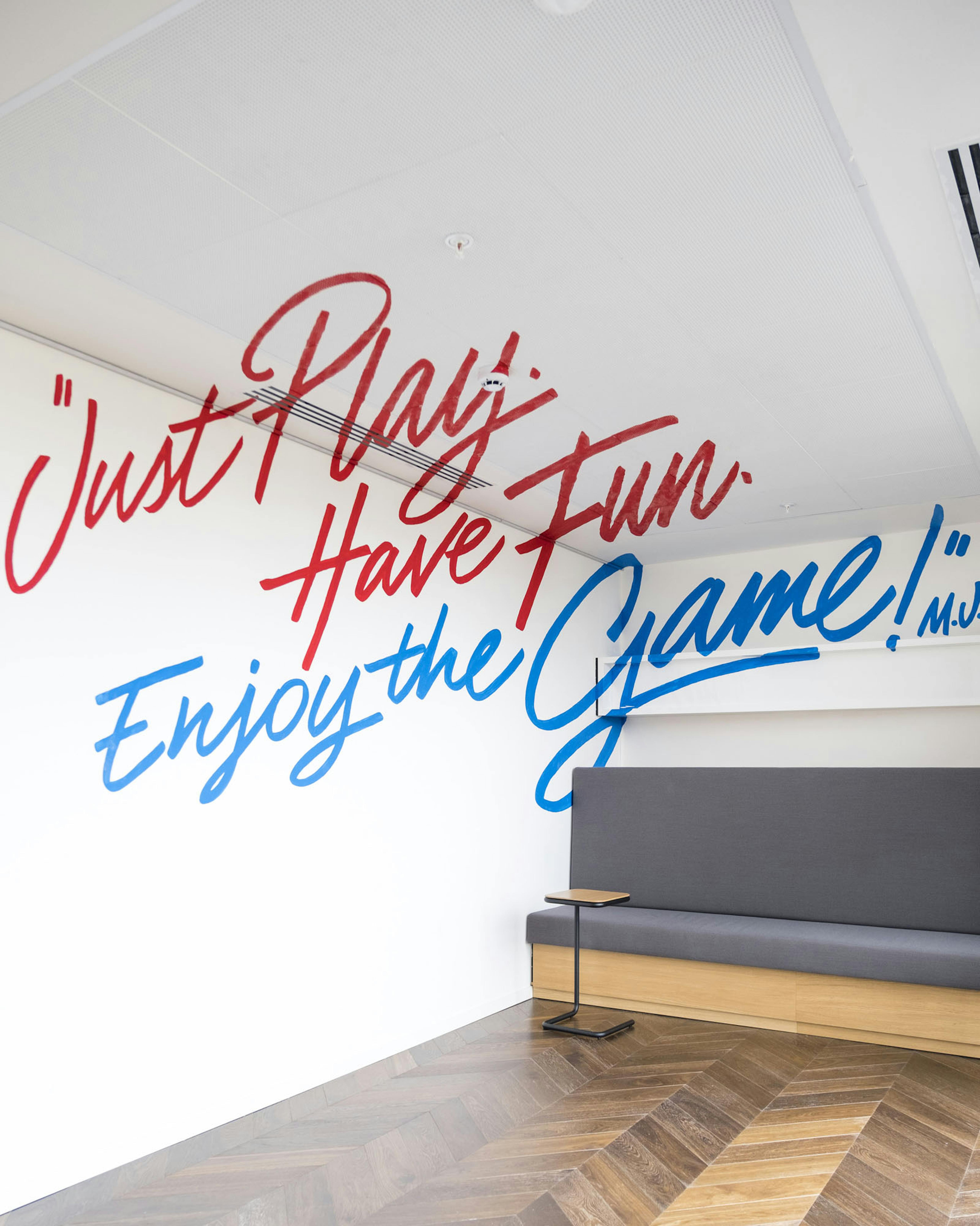 The third and final mural created for Nike’s new Paris HQ is located in the Game Room, a space where employees can relax and play. I painted a quote by Michael Jordan, “JUST PLAY, HAVE FUN, ENJOY THE GAME!”, using an anamorphic technique. The lettering appears clear when viewed from a specific angle, then becomes increasingly distorted as you move closer, creating the illusion of being pulled into a vortex, echoing the immersive spirit of play.