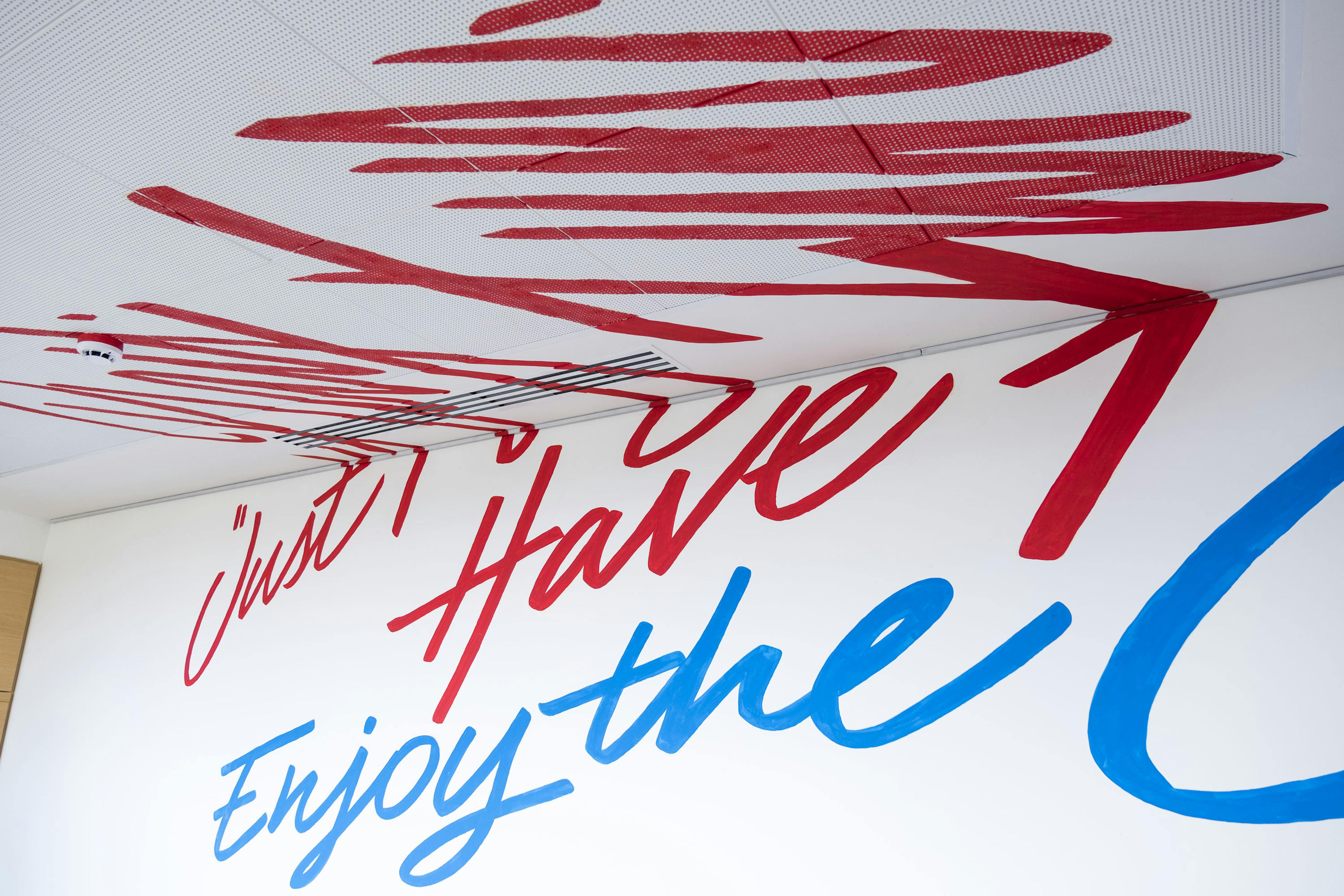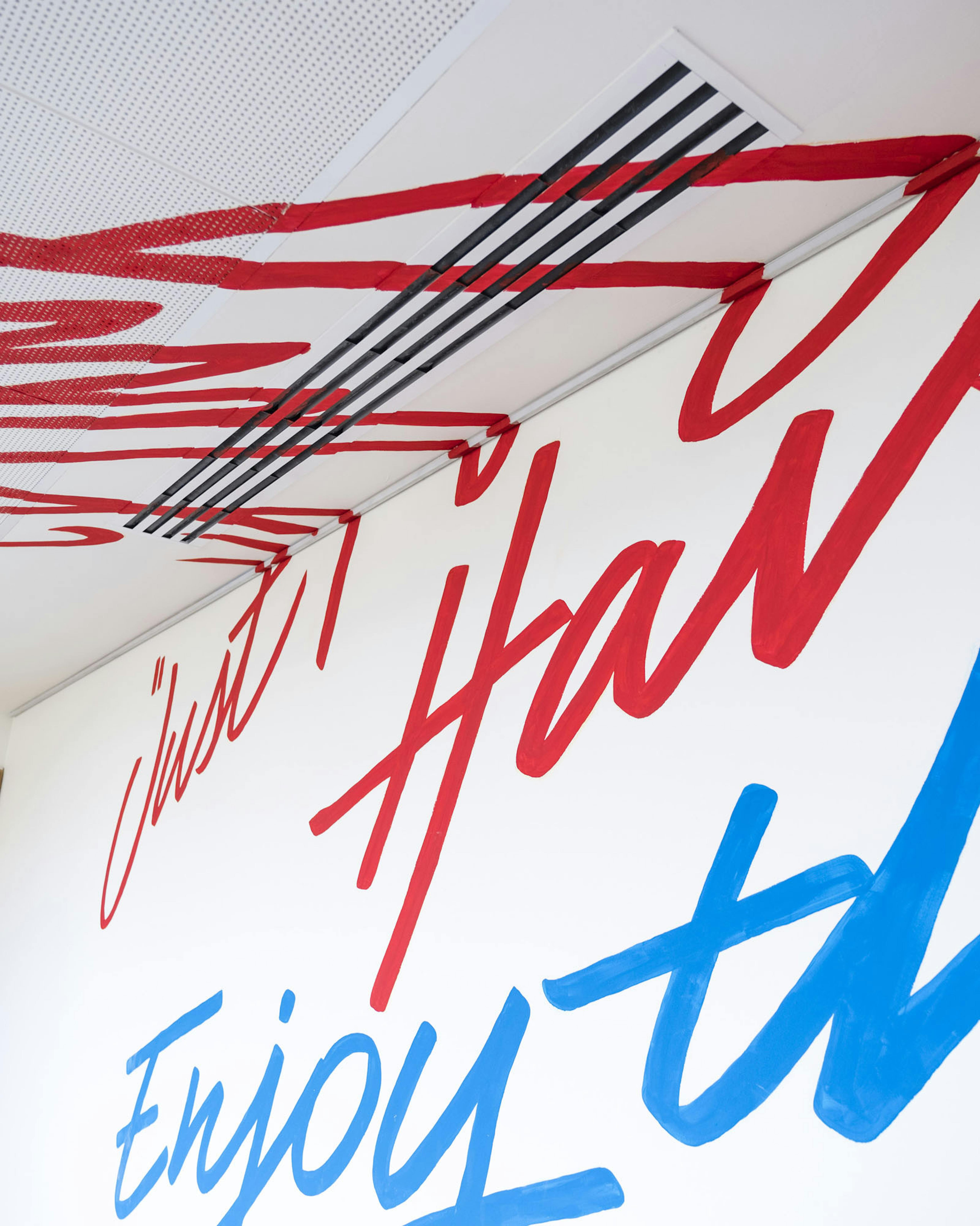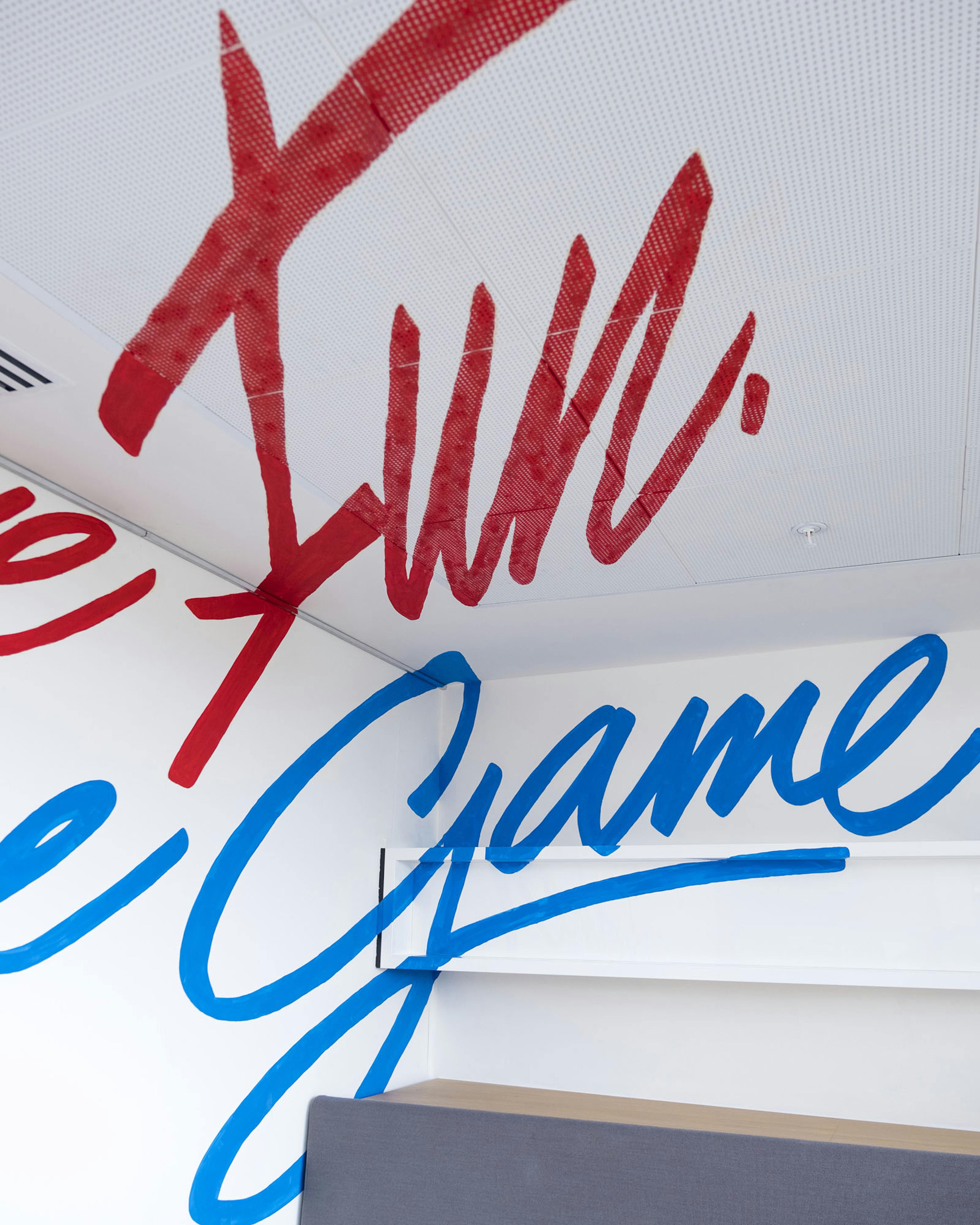 The third and final mural created for Nike’s new Paris HQ is located in the Game Room, a space where employees can relax and play. I painted a quote by Michael Jordan, “JUST PLAY, HAVE FUN, ENJOY THE GAME!”, using an anamorphic technique. The lettering appears clear when viewed from a specific angle, then becomes increasingly distorted as you move closer, creating the illusion of being pulled into a vortex, echoing the immersive spirit of play.