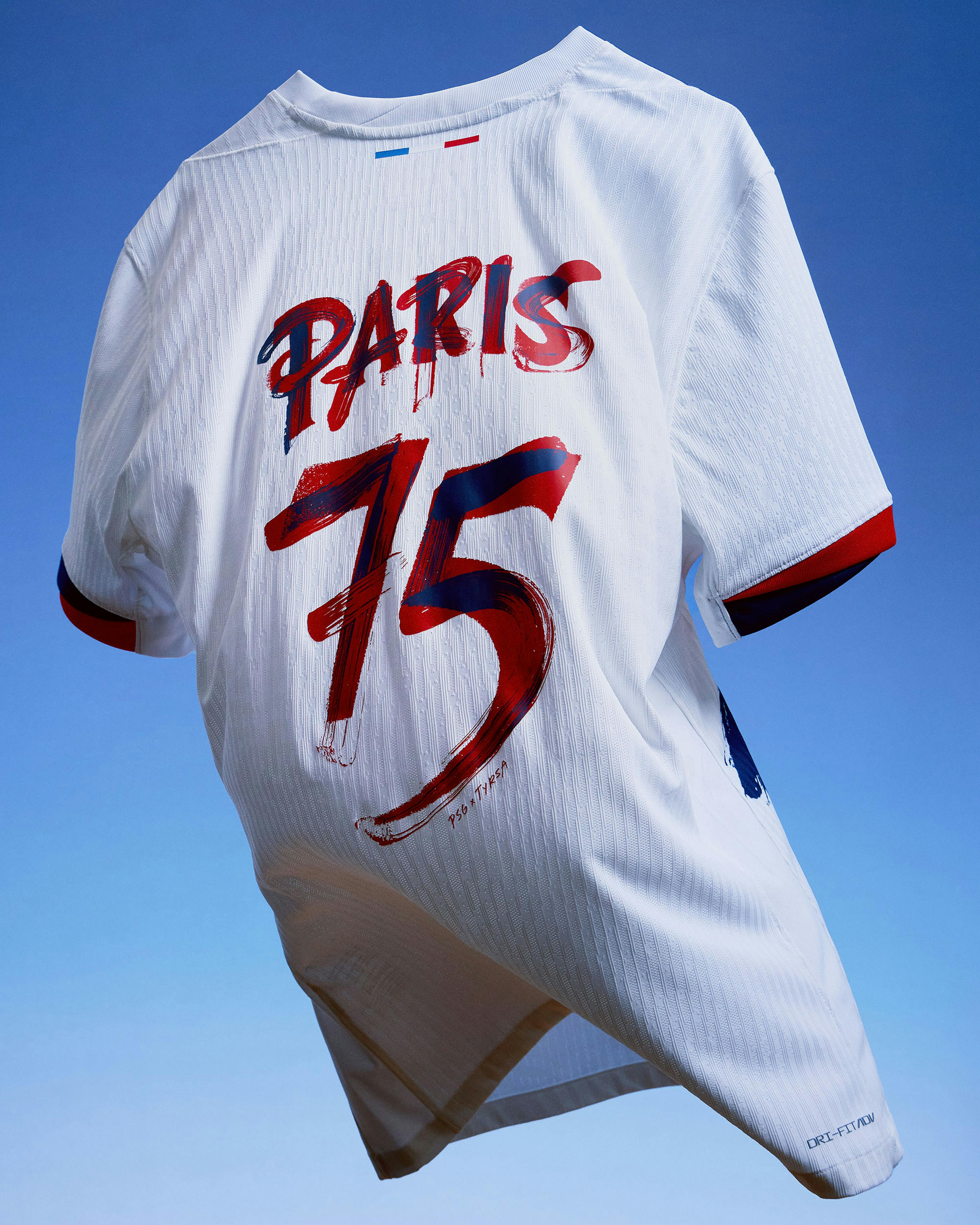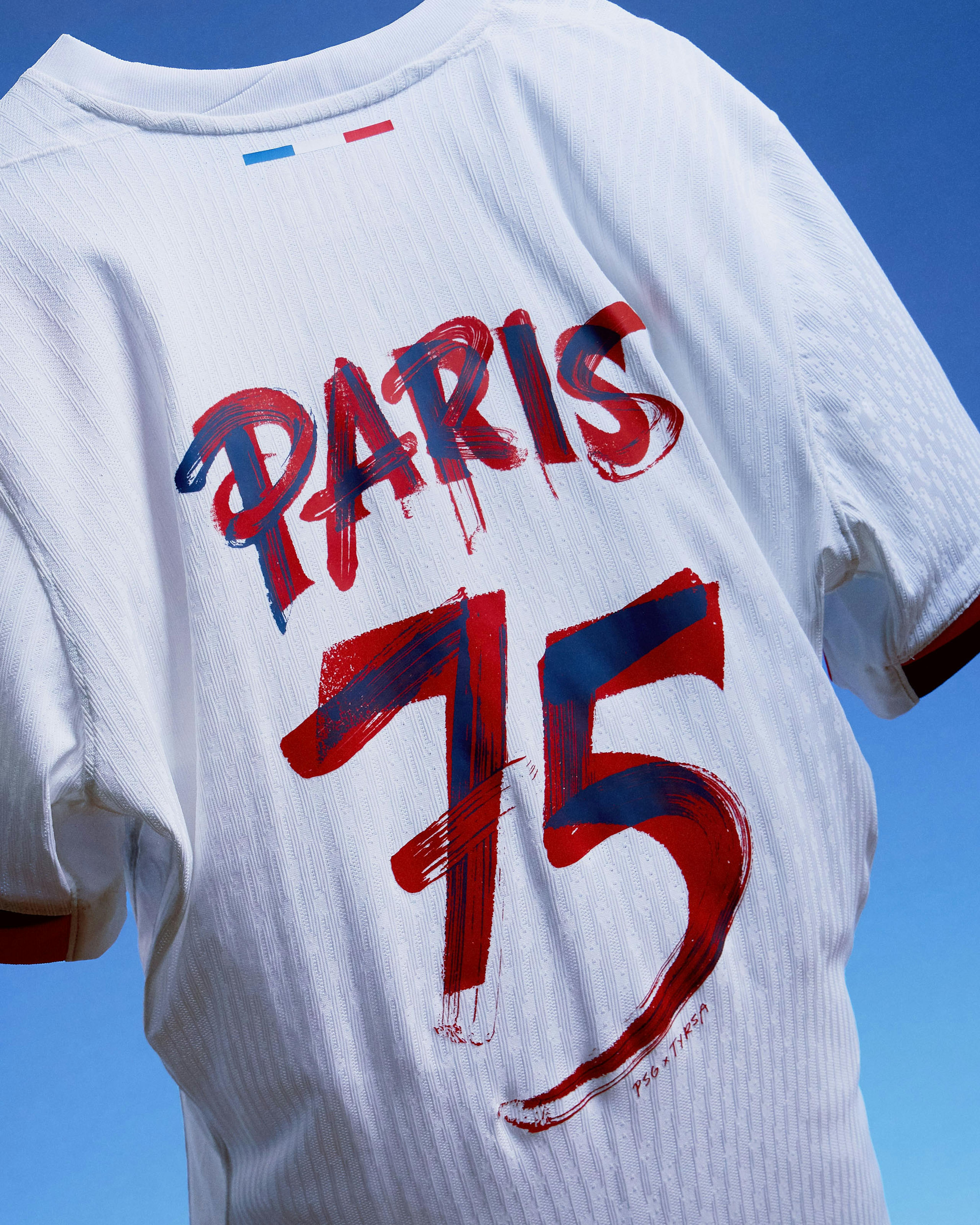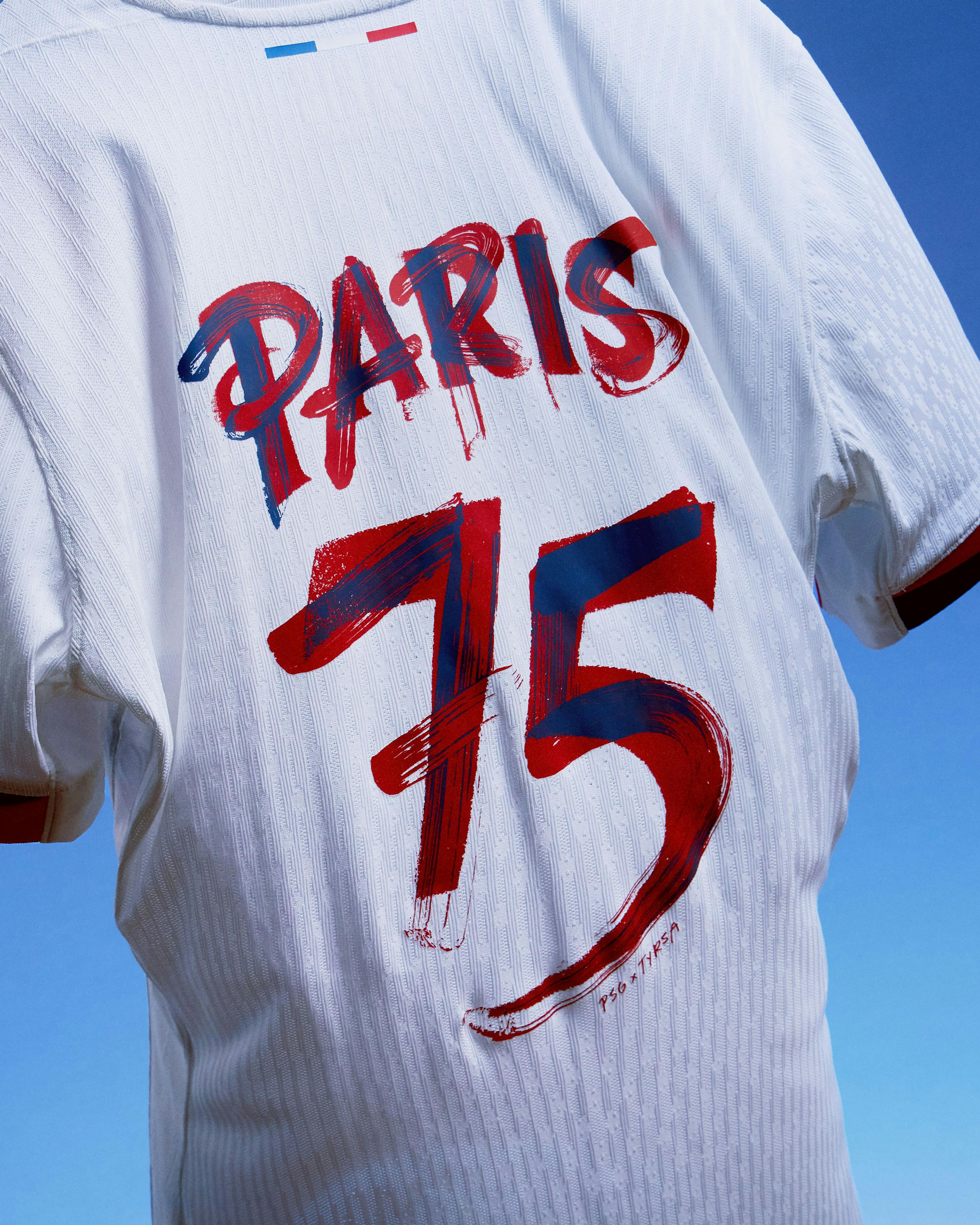 The artwork pays tribute to the Eiffel Tower’s rich history by merging two distinct typographic styles: one inspired by the 1889 Paris World Fair—the year the monument was inaugurated—and the other by the brushstroke-style Eiffel Tower graphic featured on the front of the jersey.