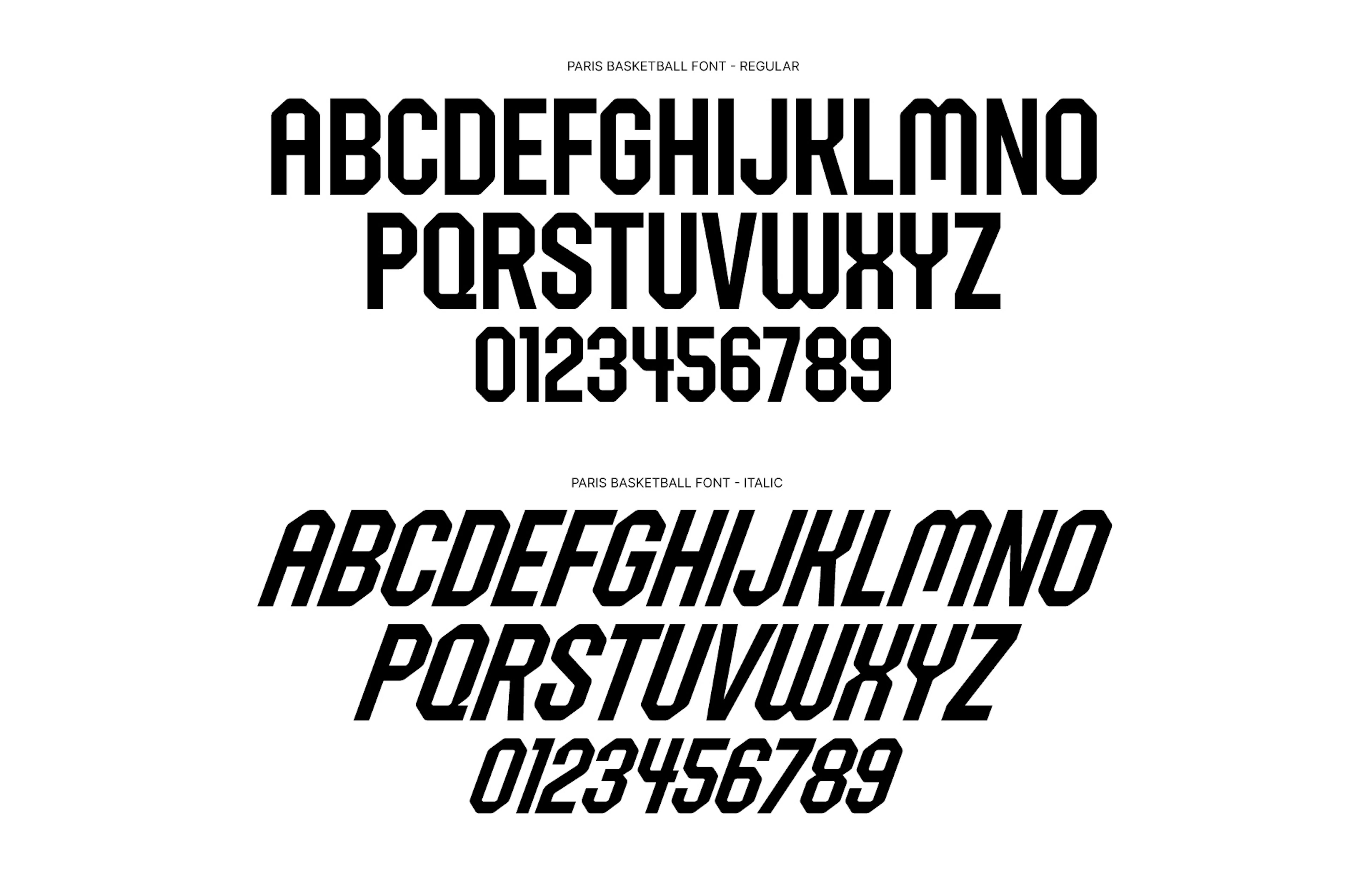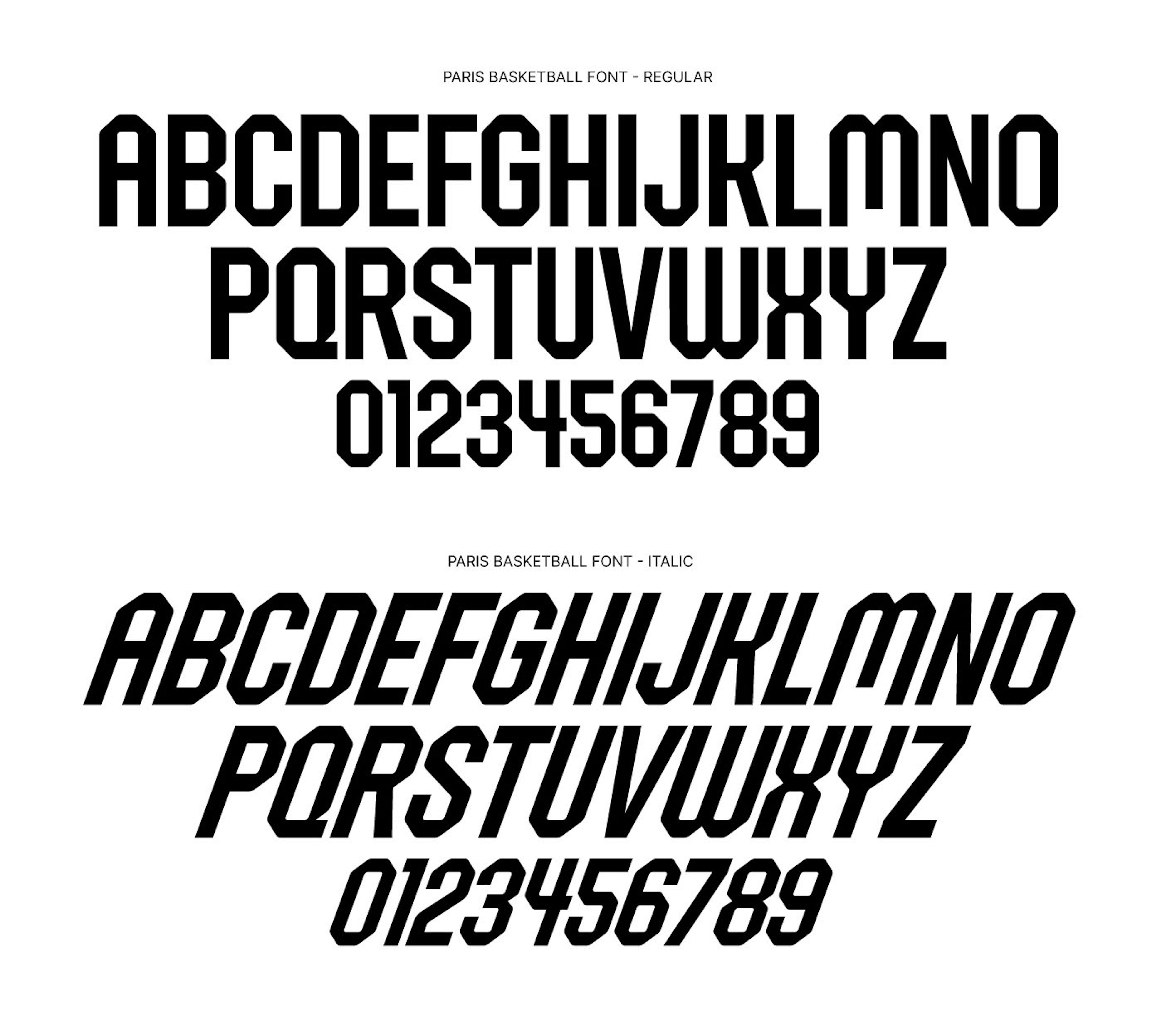 To complement the visual identity, we designed a bespoke typeface inspired by the classic typography of basketball culture and historic Parisian type specimens. Available in both Regular and Italic styles, this typeface gives the club a distinct voice across all platforms, from jerseys to arena displays to communication materials.