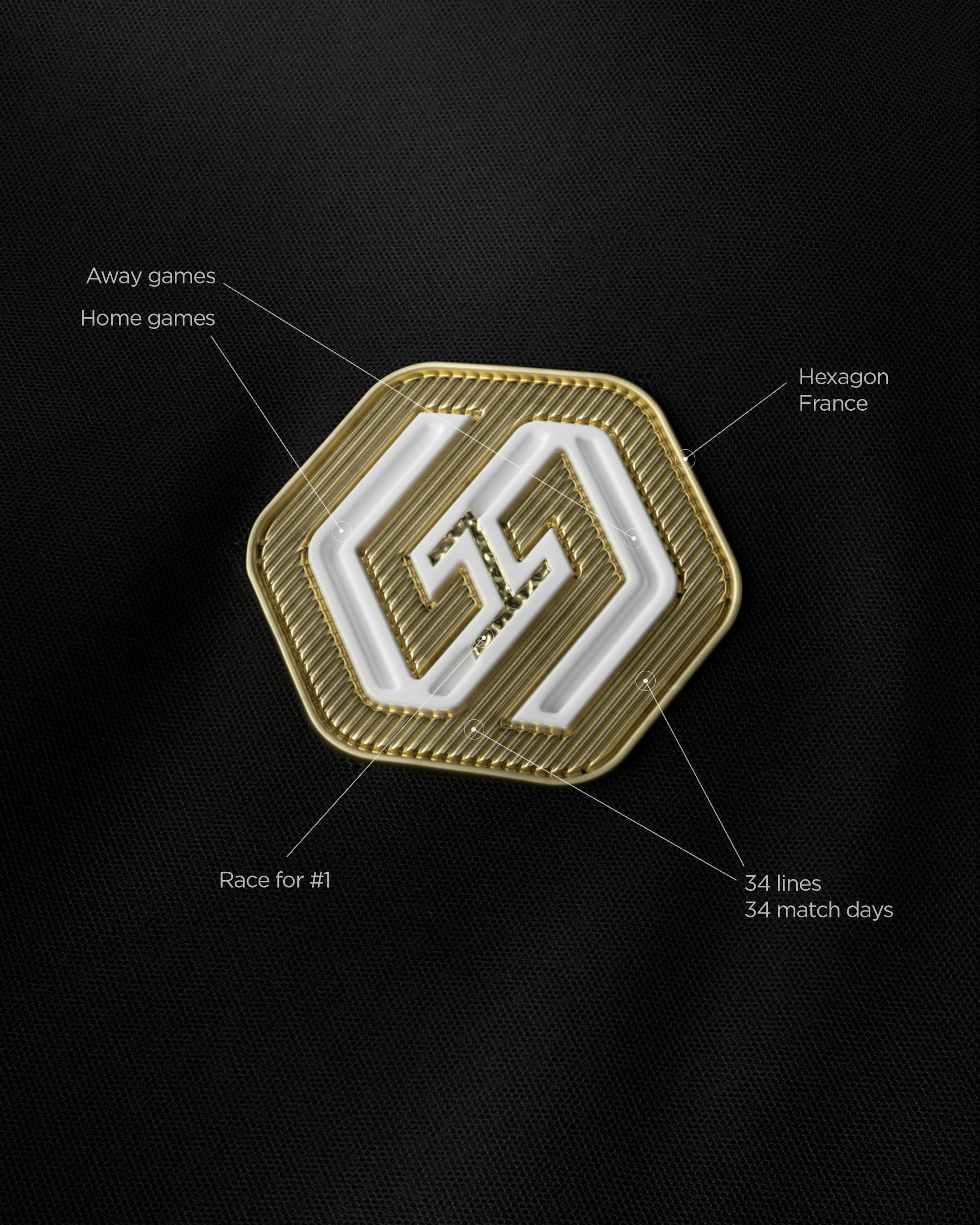 The design is framed within a hexagon, a nod to the shape of France, and encircled by 34 lines, each symbolizing one of the season’s 34 match days