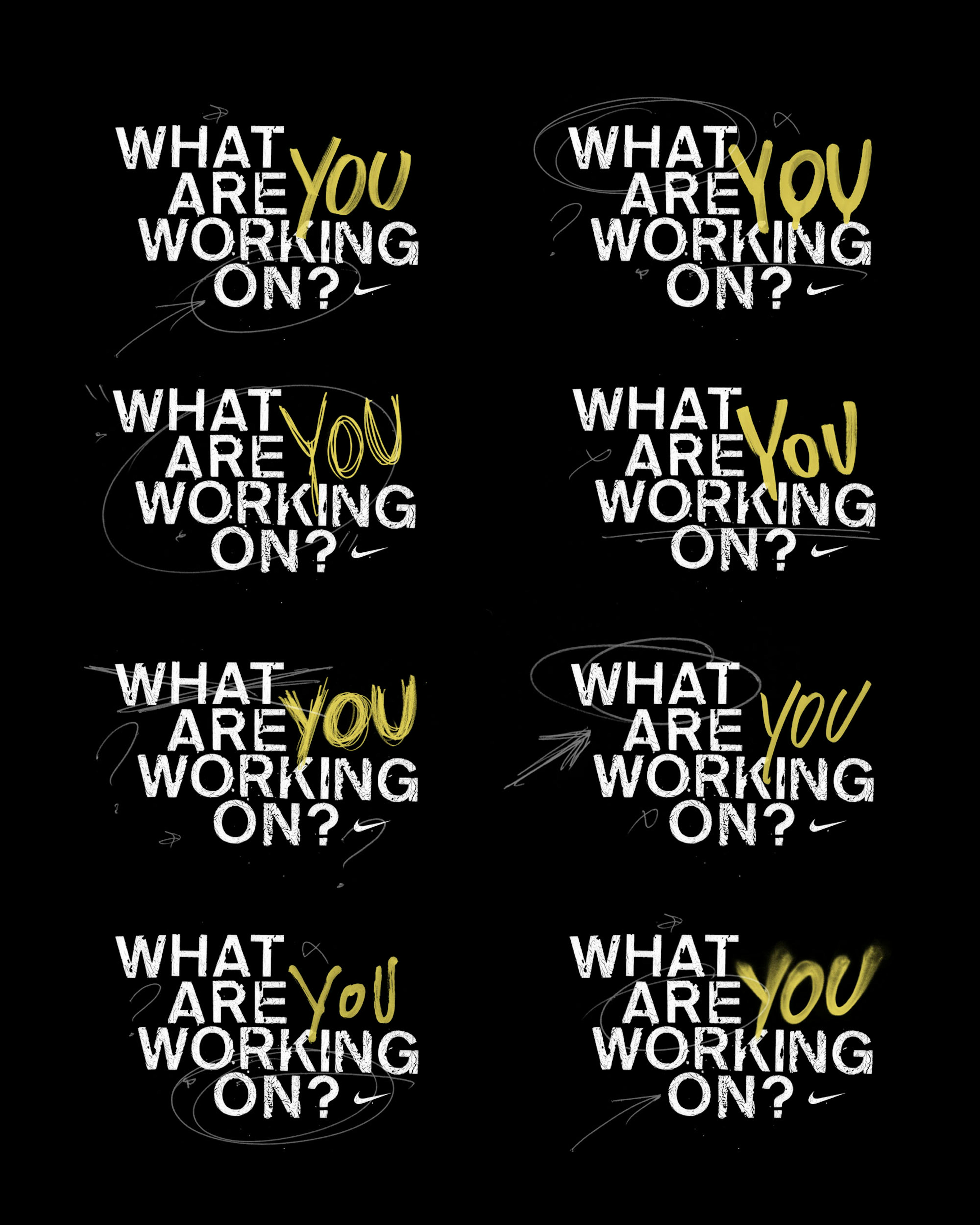 Visual identity for Nike’s “What Are You Working On?” video series, a fully analog design system celebrating athletes’ works in progress through stop-motion, hand lettering, and custom elements.